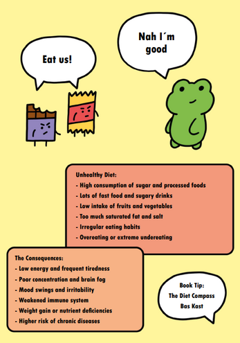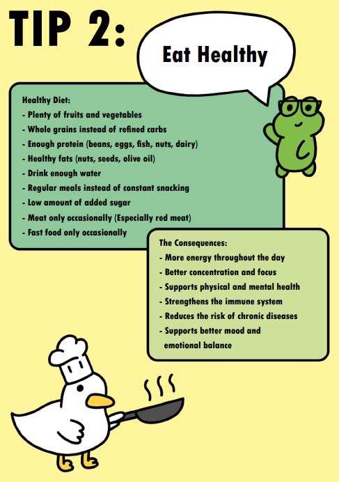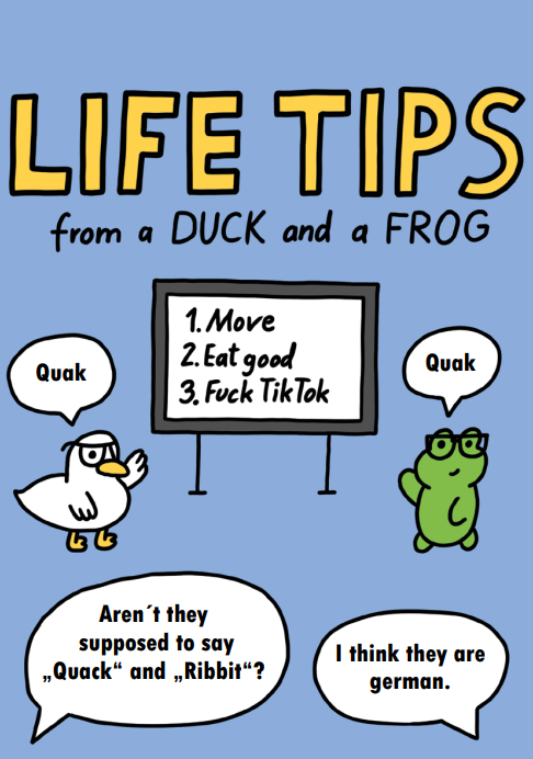 The reader is guided through the zine by two characters — a curious frog and a laid-back duck — who add humor, warmth, and personality to each page. The visual style is playful and cartoon-like, while the content stays grounded in real, practical advice that can be applied to everyday life.